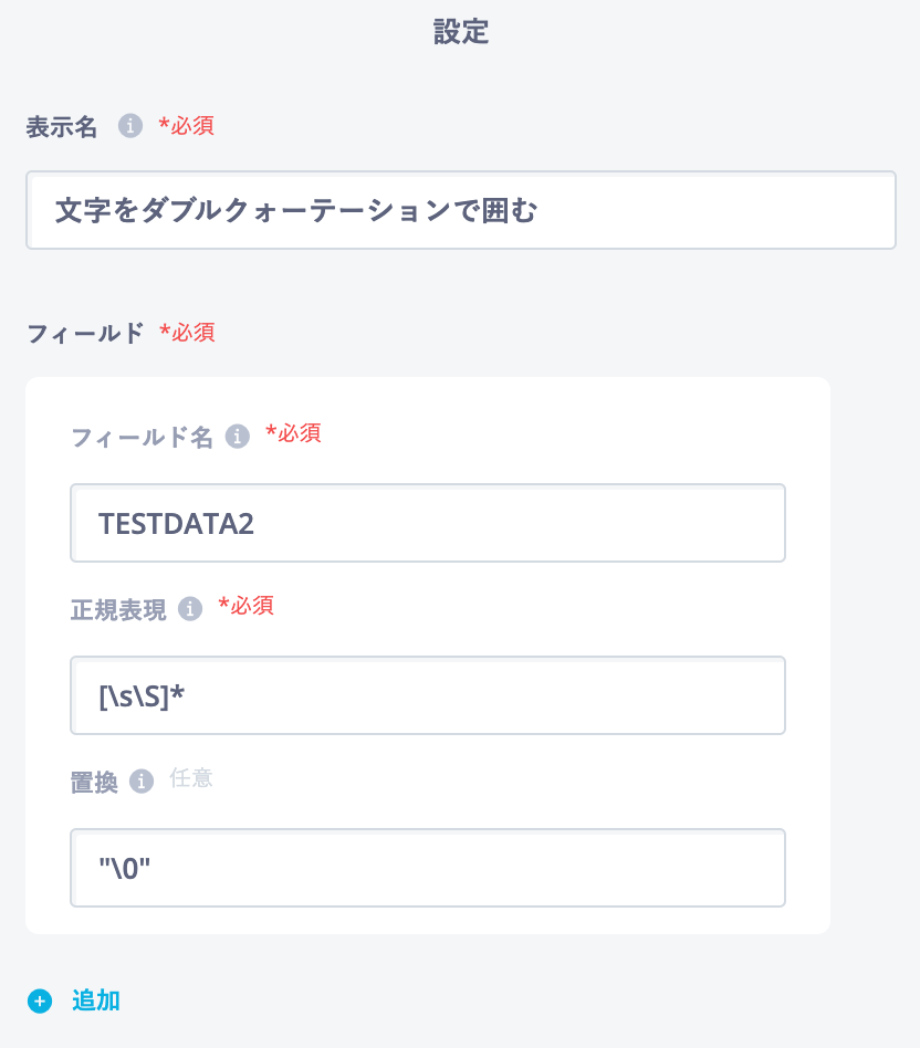 以下の内容で「置換」を設定すると、取得した文字列をダブルクォーテーション(”)で囲みます。