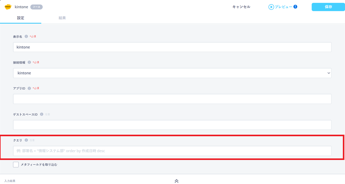「kintone」の設定項目「クエリ」をご使用ください。クエリの詳細は