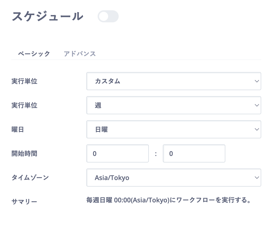 画像の通り、タイトル横のボタンをクリックし、スケジュール設定を有効にしてください。