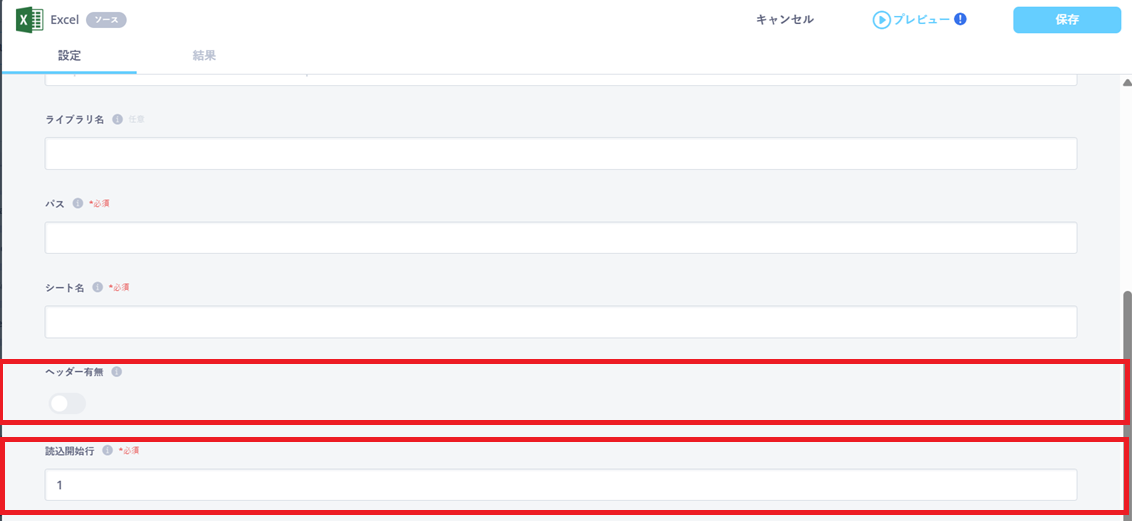 ヘッダー行がないExcelファイルでも読み込めますか? ソース「Excel」の設定画面へ表示される「ヘッダー有無」と「読込開始行」を設定すると正常にデータを取得できます。ヘッダー行なしの設定でデータを取り込むと、データのカラム名はA、B、Cと自動的に命名されます。