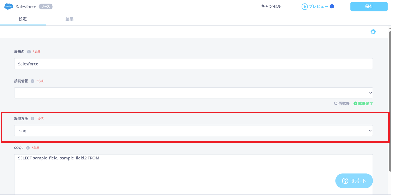 SalesforceのSOQLを使用することはできますか? 転送元Salesforceで、SOQLを使用して条件指定することができます。取得方法で「soql」を選択すると、SOQLで条件指定することができます。