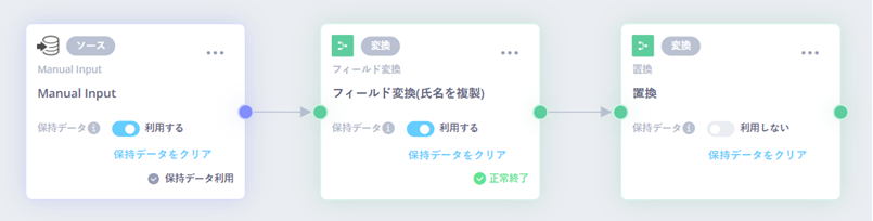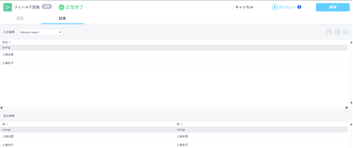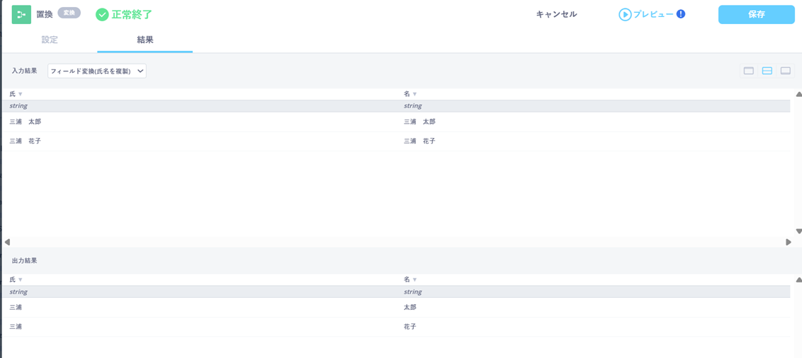 「フィールド変換」を使って「氏名」のカラムを複製し、「置換」で「氏」「名」のみを抽出し、「氏」「名」に分割したデータを作成します。
