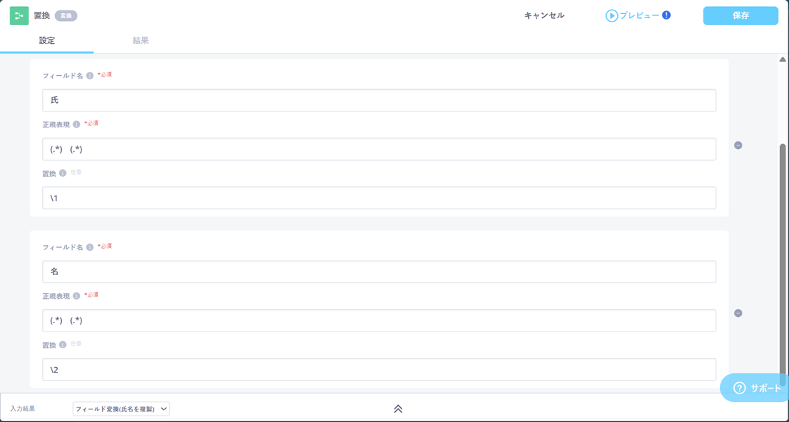 ※補足:「氏名」が半角スペース区切りの場合、正規表現は「氏」「名」ともに「(.*) (.*)」と設定