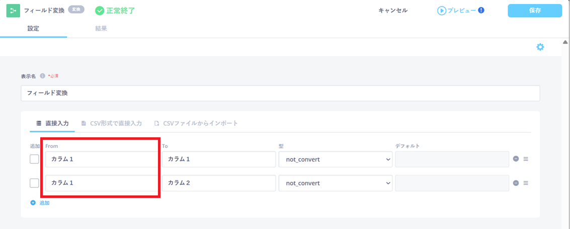 フィールド変換のFromに複製したいカラム名を入力し、Toへ複製後のカラム名を入力します。