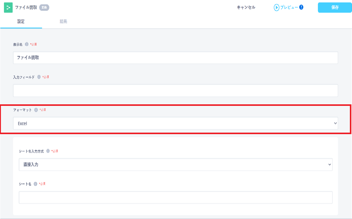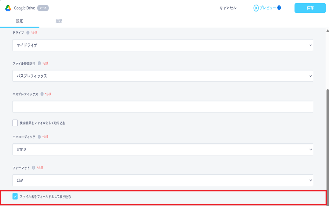 GoogleDriveにあるExcelファイルも連携できますか? Google Driveで「検索結果をファイルとして取り込む」を選択し、ファイル読取のフォーマットを「Excel」を選択するとデータを取得できます。各タスクのその他の設定項目についてはこちらをご確認ください。【転送元】Google Drive【変換】ファイル読取ワークフローイメージ【転送元】Google Drive【変換】ファイル読取
