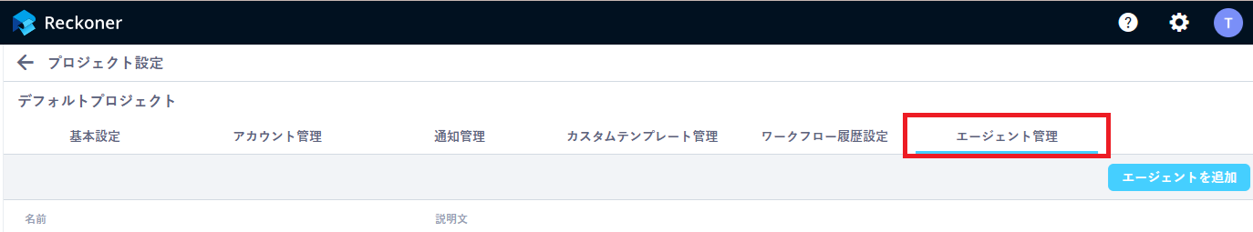 上部に並ぶタブの中から 「エージェント管理」 を選択します。