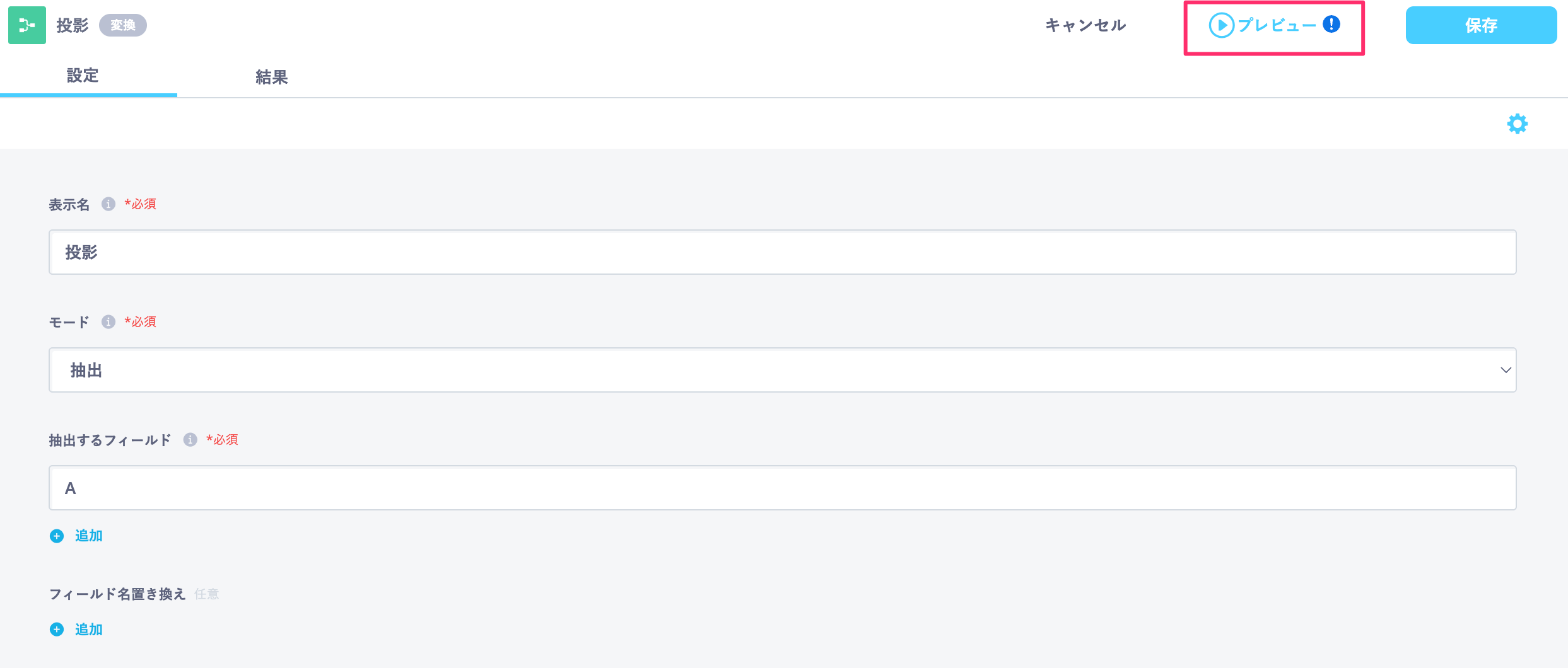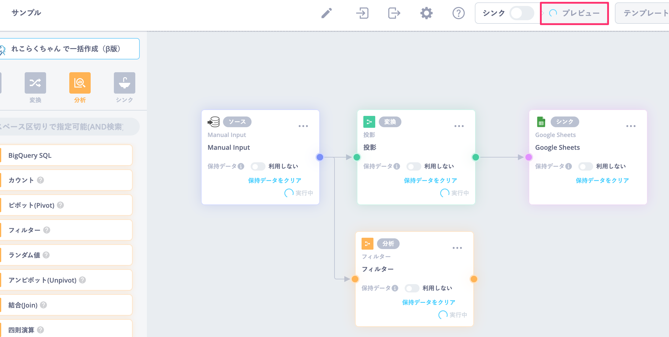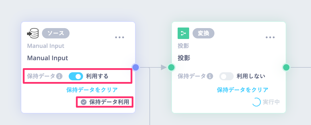 タスク内の保持データを利用するのONにすると、前回実行したプレビューデータを一時的に保持します。過去実行分のデータを利用して、後続タスクのプレビューを実行することができます。