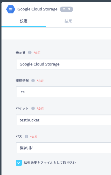 転送元(ソース)設定:接続先のクラウドストレージを選択して必要事項を入力し、「検索結果をファイルとして取り込む」をチェックします。