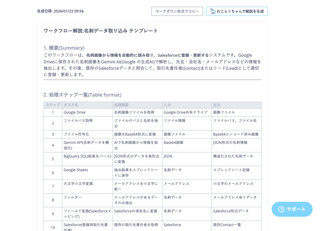 - 出力された解説は、ワークフローを編集しても自動で更新はされません。ワークフローを編集、更新した場合は再出力を行ってください。