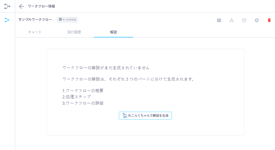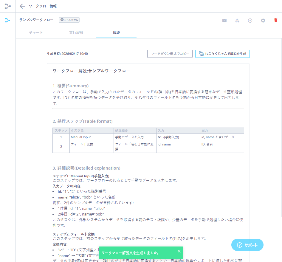 自動更新されません:ワークフローを編集・更新しても、既存の解説は自動で更新されません。内容を変更した場合は、再度「れこらくちゃんで解説を生成」をクリックして再出力を行ってください。