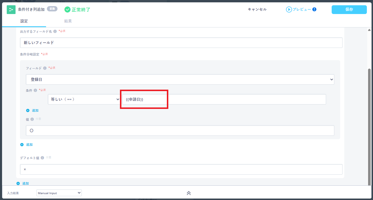 各タスクの設定項目において、固定の値を直接入力する代わりに、前のタスクから渡されたデータの値を動的に利用する機能です。 {{フィールド名}} 形式で記述することで、実行ごとに変わる値(日付や特定の項目値など)を自動的に反映できます。