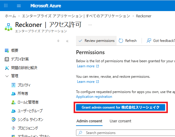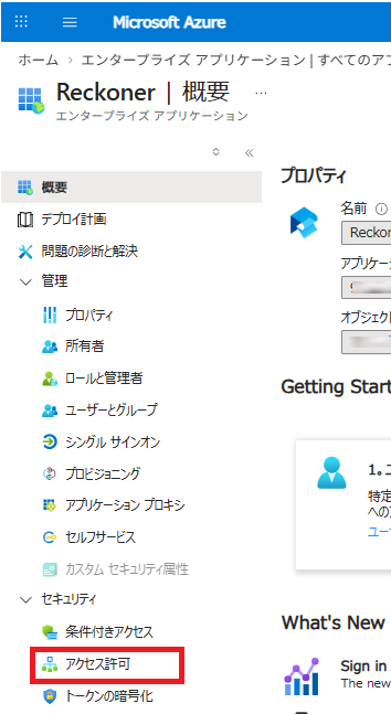 ※リストにない場合は、一度ユーザーがReckoner画面からログインを試行してください。エラー画面が表示された後、Azure Portalの画面をブラウザで再読み込みすると反映されます。左メニューの [セキュリティ] > [アクセス許可] を選択します。