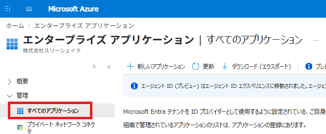 Azure Portal (Microsoft Entra ID) にログインし、[エンタープライズ アプリケーション] > [すべてのアプリケーション] を開きます。