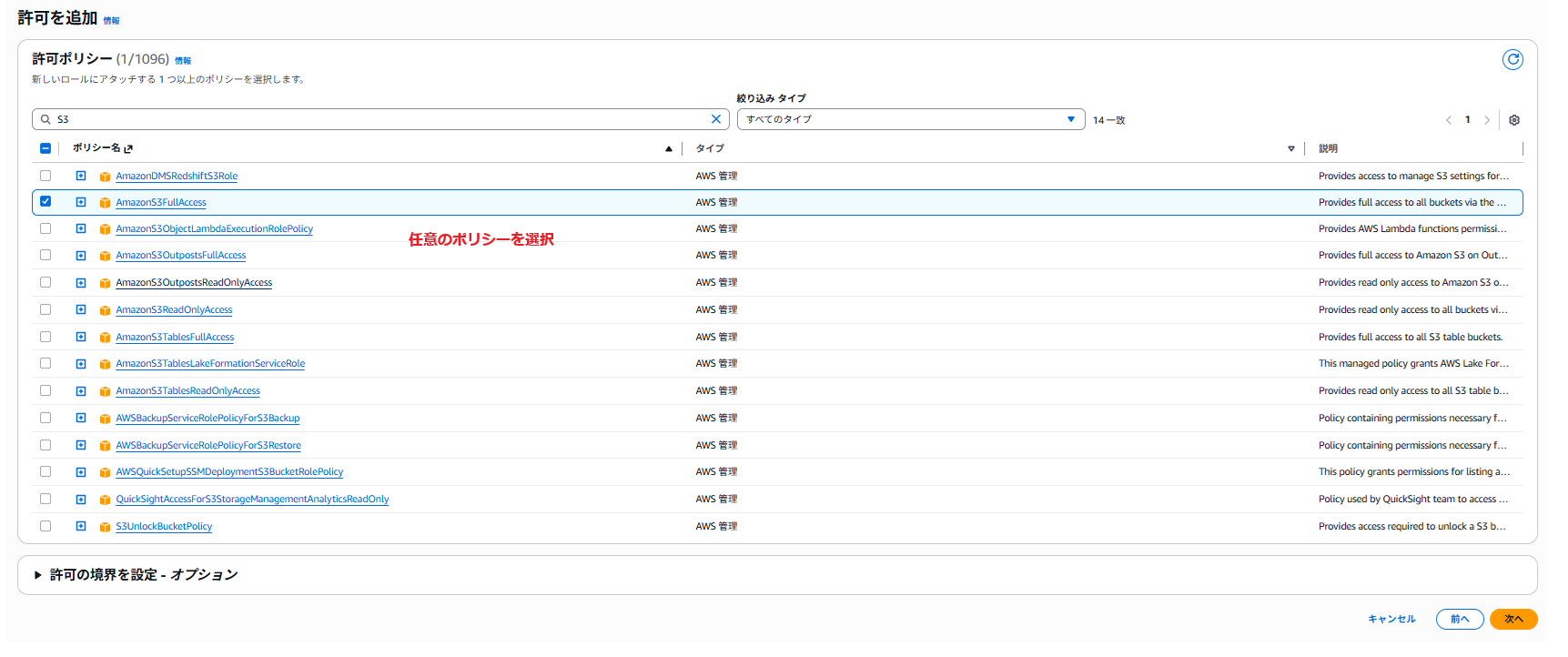 3 「許可を追加」画面で、ロールに付与する権限のポリシー(例: AmazonS3FullAccess 等)を選択し、次のステップへ移ります。