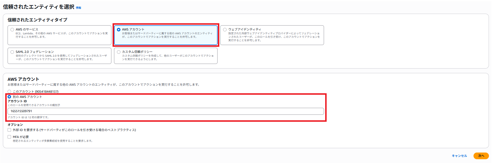 2 「信頼されたエンティティを選択」画面で、「AWSアカウント」タイルを選択し、「別のAWSアカウント」にチェックを入れ、アカウントID欄に 165515509791 を入力して次のステップへ移ります。