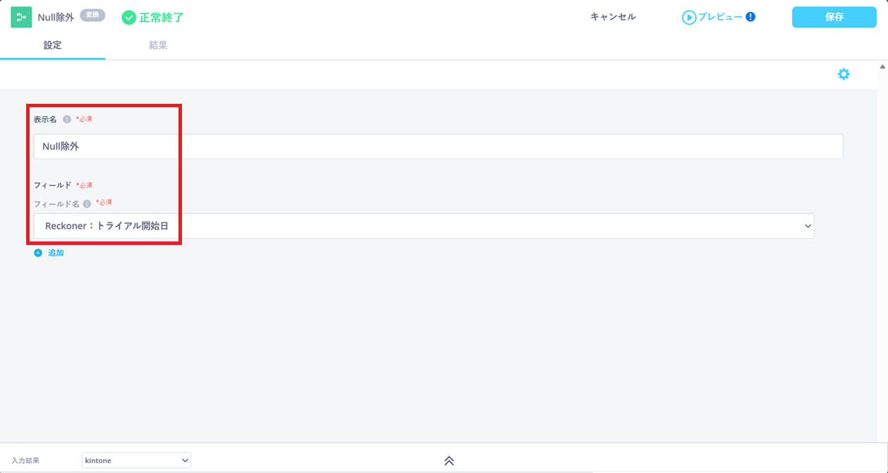 | フィールド名 | 必須 | データがnullであるか否かを確認したいフィールド名を選択 |