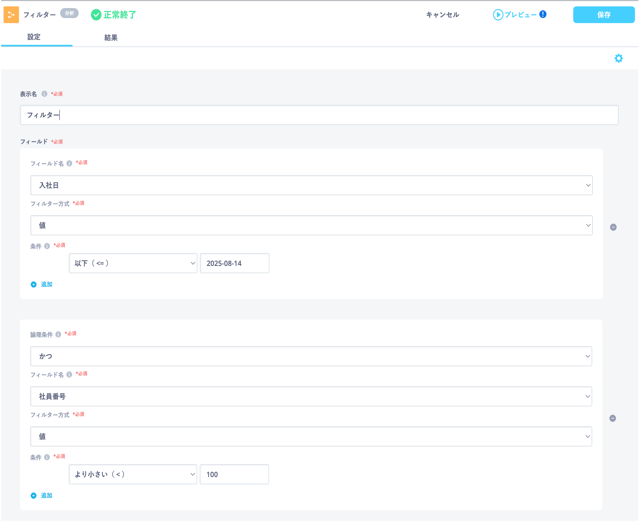 「フィルター」では、フィルタリング条件に一致したレコードを抽出します。