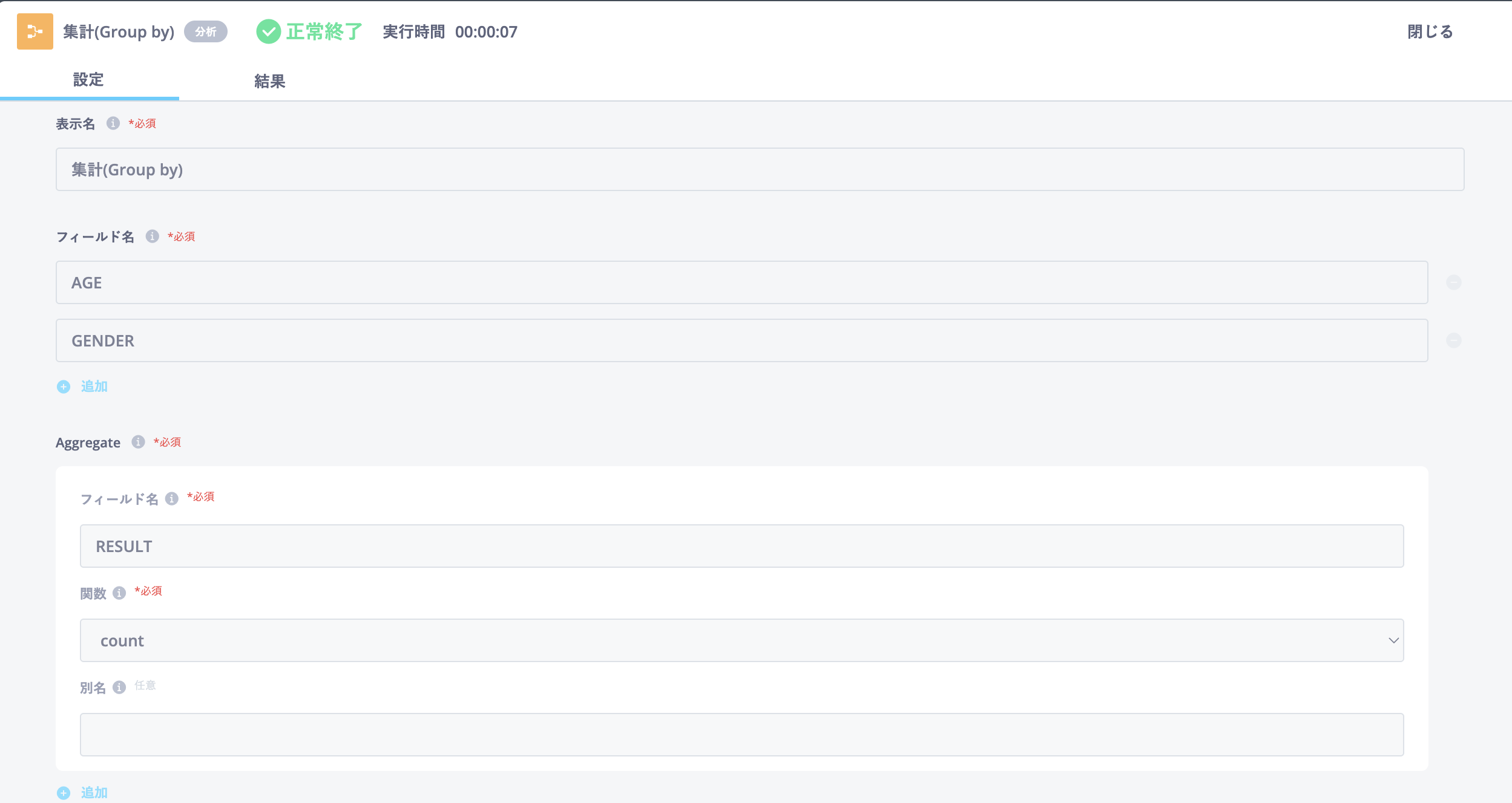 | Aggregate 別名 | 任意 | 計算結果を格納するフィールド名を別名に変更したい場合に、新しいフィールド名を入力 ※設定しない場合は、「Aggregate フィールド名」に指定したフィールド名が表示される |