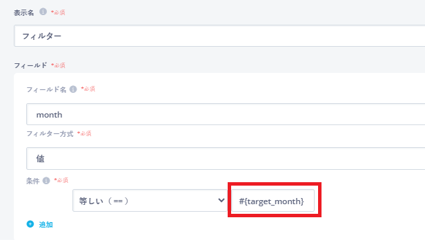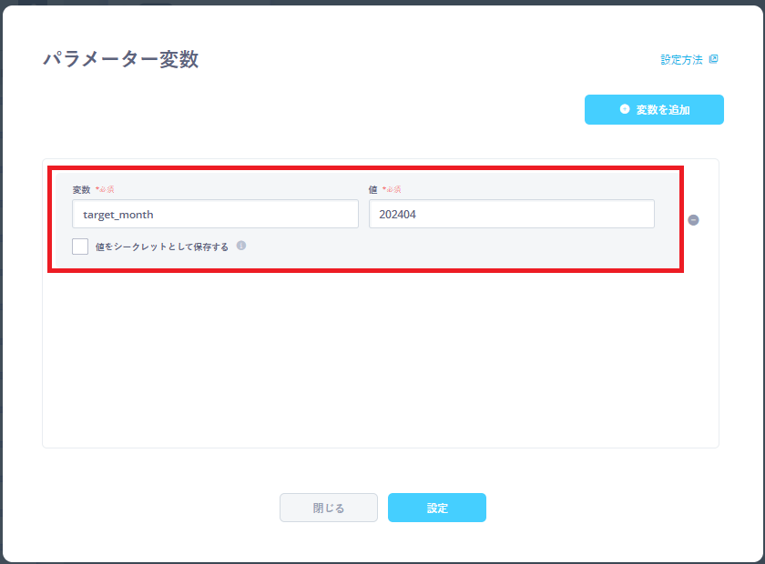 | 変数 | 必須 | 任意の変数名を入力します(例:target_month) |