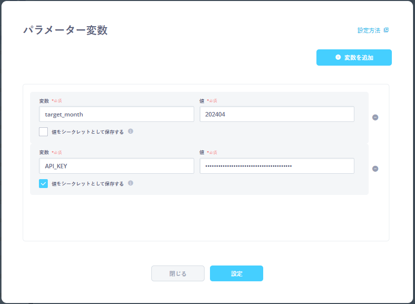 | 値をシークレットとして保存する | 任意 | チェックを入れると値がマスクされ、保存後は参照不可になります APIキーやパスワード等の機密情報の管理に適しています |